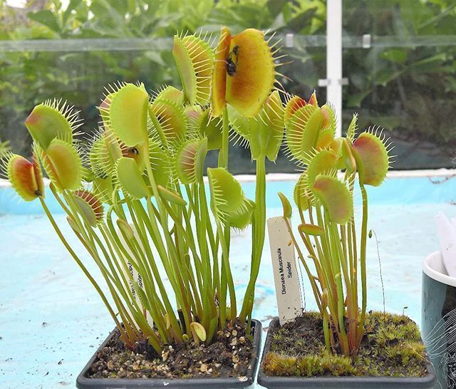 Venus Spider, este curioso cultivar desarrolla peciolos muy largos, rectos y erguidos. En lo alto del peciolo crece una trampa o boca de tamaño mediano que puede cerrar rápidamente. En invierno arquea sus peciolos hacia abajo lo que le da el aspecto de patas de araña, es una de las dionaeas más curiosas de nuestra colección.